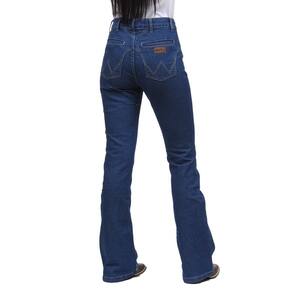 Calça jeans feminina na qualidade Wrangler modelo Flare, fabricada em tecido costurado 72% Algodão, 26% Poliéster e 2% Elastano na cor Azul, possui 3 bolsos na frente e 2 atrás em modelo tradicional, rebites de metal e botão personalizado.