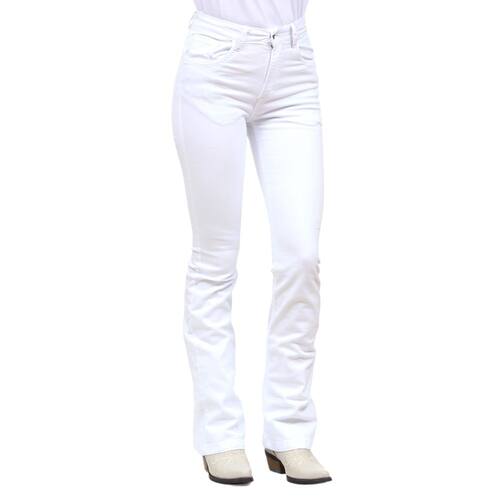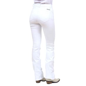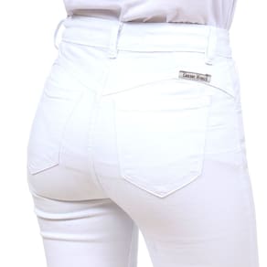 Calça Jeans Feminina na qualidade Cowboy Winner modelo Boot Cut, fabricada em tecido Brim trabalhado na cor Branco, possui 3 bolsos na frente e 2 atrás em modelo tradicional, rebites de metal e botão personalizado.