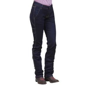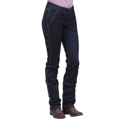 Calça Jeans Feminina modelo Carpinteira da marca Cowboy Winner, esta peça é fabricada em tecido jeans 74% Algodão, 24,5% Poliéster e 1,5% Elastano na cor Azul, possui 3 bolsos na frente, 1 lateral e 2 atrás em modelo tradicional com costuras, alça para colocar ferramentas na lateral,  rebites de metal e botão personalizado, realçando a qualidade do produto. Uma calça que é resistente para todas as situações e que pode se confiar.