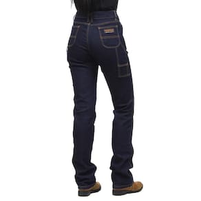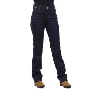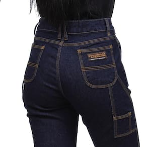 Calça jeans Carpinteira feminina na qualidade Os Vaqueiro, fabricada em tecido 99% Algodão e 1% Elastano na cor Azul Escuro, possui 4 bolsos na frente e 4 atrás em modelo tradicional e na lateral, rebites de metal e botão personalizado.