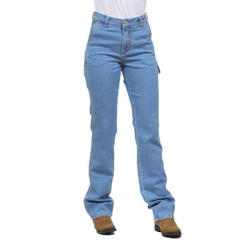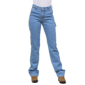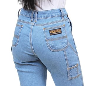Calça jeans Carpinteira feminina na qualidade Os Vaqueiro, fabricada em tecido 99% Algodão e 1% Elastano na cor Delavê, possui 4 bolsos na frente e 4 atrás em modelo tradicional e na lateral, rebites de metal e botão personalizado.