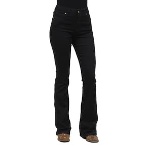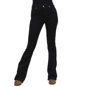 Uma Calça jeans feminina na qualidade Wrangler modelo Flare, fabricada em tecido jeans de alta qualidade 80% Algodão, 18% Poliéster e 2% Elastano de alta qualidade na cor Preta, possui 3 bolsos na frente e 2 atrás em modelo tradicional, rebites de metal e botão personalizado.