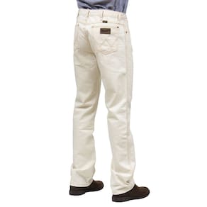 Uma Calça jeans Masculina da marca Wrangler modelo Cowboy Cut, perfeita para os cowboys que precisam de uma calça robusta para a vida no campo ou para o dia a dia da cidade. Esta fabricada em tecido 100% Algodão de alta qualidade na cor Bege, possui três bolsos na frente e 2 atrás em modelo tradicional, rebites de metal e botão personalizado.