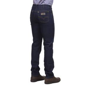 Calça jeans masculina na qualidade Land Horse, fabricada em tecido 74% Algodão 24% Poliéster 2% Elastano na cor Azul Escuro, possui 3 bolsos na frente e 2 atrás em modelo tradicional, rebites de metal e botão personalizado.