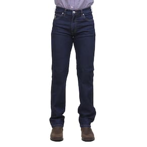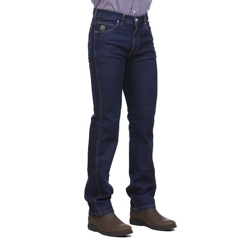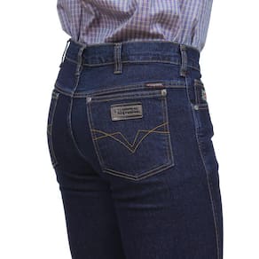 Calça jeans masculina na qualidade Os Vaqueiros, fabricada em tecido 74% Algodão 24% Poliéster e 2% Elastano na cor Azul Escuro, possui 3 bolsos na frente e 2 atrás em modelo tradicional, rebites de metal e botão personalizado.