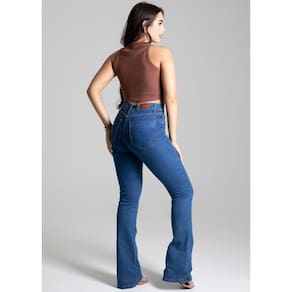 A modelagem boot cut tem o caimento ajustado nas pernas e levemente ampla barra. Cintura média Fechamento com botão e zíper Bolsos frontais falsos e posteriores funcionais Barra simples Modelagem: boot cut Tecido: Jeans Tipo de lavagem: Azul Cor: Azul médio