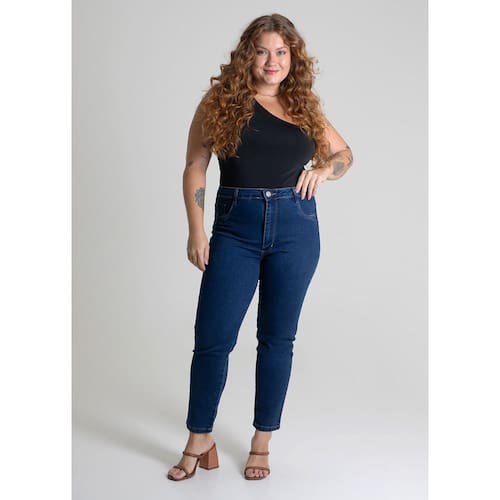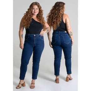 Calça plus size confeccionada em jeans. A modelagem tem tecnologia para dar um UP na silhueta Cintura alta Fechamento com botão metálico e zíper Bolsos frontais falsos e bolsos traseiros funcionais Barra simples Modelagem: Plus size Tecido: Jeans Tipo de lavagem: Azul Cor: Azul escuro