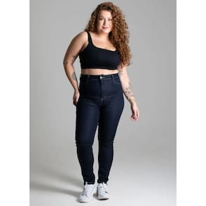 Calça plus size confeccionada em jeans. A modelagem tem quatro pences que valorizam as formas. Cintura alta Fechamento com botão metálico e zíper Bolsos frontais falsos e bolsos traseiros funcionais Barra simples Modelagem: Plus size levanta bumbum Tecido: Jeans Tipo de lavagem: Azul Cor: Azul escuro