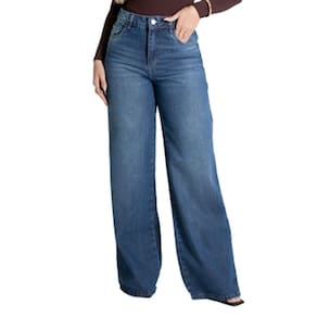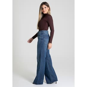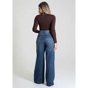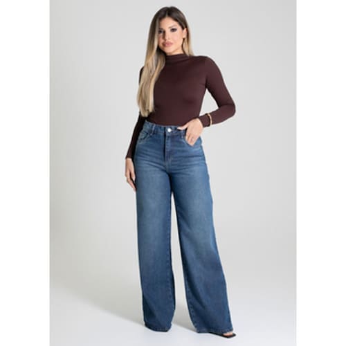 Calça feminina confeccionada em jeans. O modelo possui cintura super alta, gancho no lugar e caimento amplo da coxa até a barra. Cintura alta Fechamento através de um botão e zíper Bolsos frontais e posteriores funcionais Barra simples Tecido: Jeans Tipo de Lavagem: Azul Cor: Azul