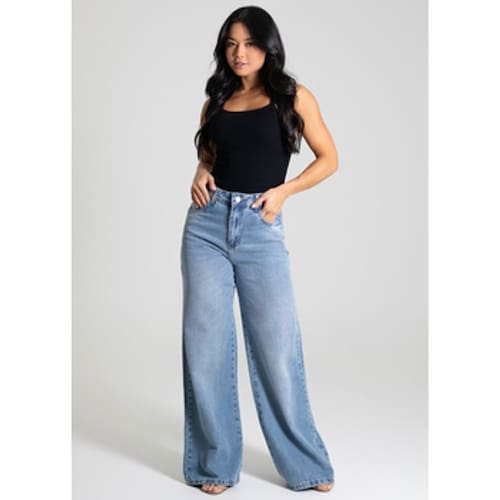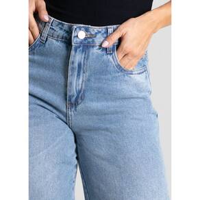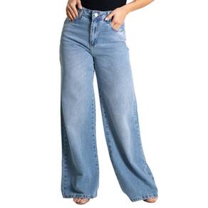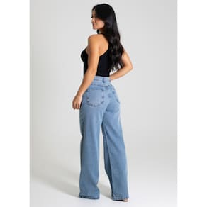Calça feminina confeccionada em jeans. O modelo possui cintura super alta, gancho no lugar e caimento amplo da coxa até a barra. Cintura alta Fechamento através de um botão e zíper Bolsos frontais e posteriores funcionais Barra simples Tecido: Jeans Tipo de Lavagem: Azul Cor: Azul