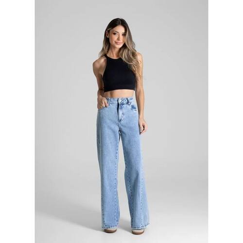 Calça feminina confeccionada em jeans. O modelo possui cintura super alta, gancho no lugar e caimento amplo da coxa até a barra. Cintura alta Fechamento através de um botão e zíper Bolsos frontais e posteriores funcionais Barra simples Tecido: Jeans Tipo de Lavagem: Azul Cor: Azul claro