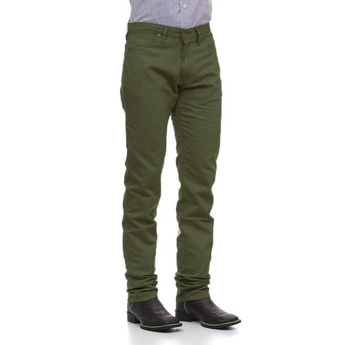 Calça masculina Wrangler modelo Cowboy Cut, fabricada em tecido 100% Algodão na cor Verde, possui 3 bolsos frontais e 2 traseiros em modelo tradicional, etiqueta da marca no bolso, rebites de metal e botão personalizado.
