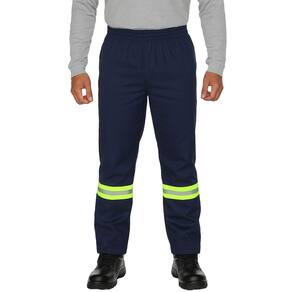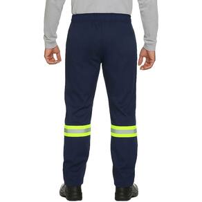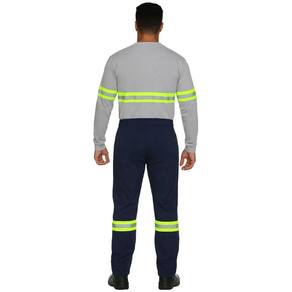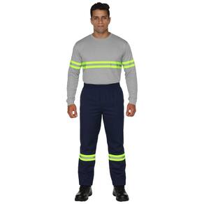 O grande diferencial está na faixa refletiva de segurança em tecido gorgurão 100% poliéster na cor verde fluorescente, com 5 cm de largura, aplicada com costura dupla na parte frontal e traseira das duas pernas.