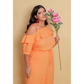 Débora Fernandes veste tamanho 50/52: Busto 118 cm, Cintura 100 cm, Abdômen 120 cm e Quadril 130 cm.