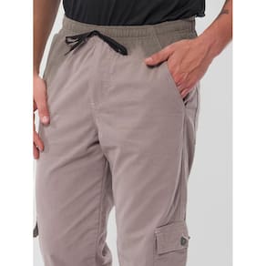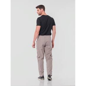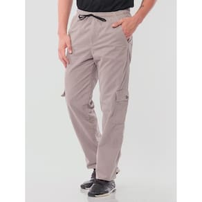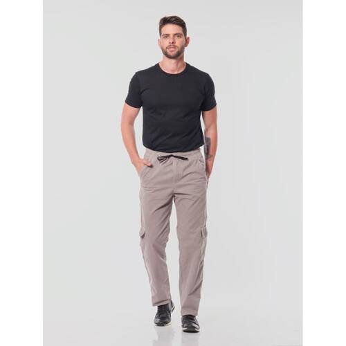 Calça sarja, modelagem mais larga, maior conforto.