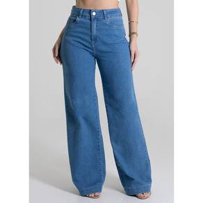 Calça feminina confeccionada em jeans. O modelo possui cintura super alta, gancho no lugar e caimento amplo da coxa até a barra. Cintura alta Fechamento através de um botão e zíper Bolsos frontais e posteriores funcionais Barra simples Tecido: Jeans Tipo de Lavagem: Azul Cor: Azul claro
