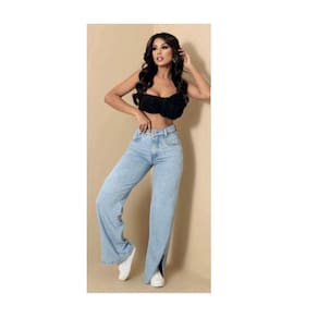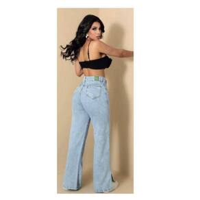 Calça Jeans feminina Wide Leg, sem elastano com abertura Lateral Azul Claro. Fechamento com zíper e botão. Bolsos dianteiros invísivel e traseiros usáveis. Composição de 100% Algodão As medidas são aproximadas podento ter uma pequena diferença.