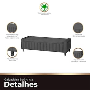 Eleve o estilo do seu quarto com a Calçadeira Baú Estofada Alicia, uma fusão perfeita de modernidade e sofisticação. Seu design estiloso e detalhes em formato de ripas na frente conferem uma estética única, enquanto o assento liso adiciona um toque de elegância discreta. Além de funcional como baú, esta calçadeira é mais do que um móvel; é uma peça de design que transforma o ambiente. Com uma decoração inigualável, a Alicia é o complemento perfeito para o seu quarto, proporcionando um toque de elegância que não passará despercebido. Renove o seu espaço com esta calçadeira que transcende o convencional.