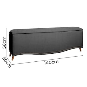CARACTERISTICAS DO PRODUTO: Material da Estrutura: Madeira de eucalipto Material e Densidade da Espuma: Poliuretano sem carga Revestimento: Linho Tipo de Pé: Em madeira chanfrado de 10,5 cm Possui Frame: Não Pistões no Baú: Sim