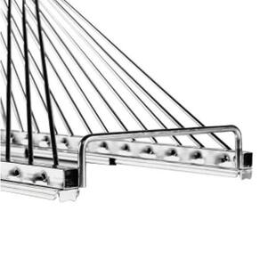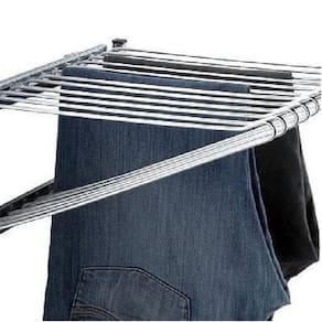 Produto confeccionado em aço carbono, com estrutura tubular e puxadores em arames de 6 mm. Contém 12 varetas aramadas. Acompanha trilhos telescópicos, que vão montados na peça. Acompanha também distanciadores plásticos. Para uso dentro de armários. Tem o acabamento cromado e capacidade para 1 calça por vareta, ou 6 Kg.