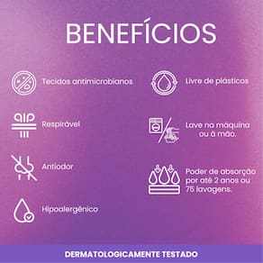 Produzida com uma tecnologia 100% antimicrobiana, que combate a proliferação do fungo Candida albicans, responsável pela candidíase, além de serem respiráveis e antiodor, garantindo máxima proteção no dia a dia. Com poder de absorção por até 2 anos ou 75 lavagens após o primeiro uso.