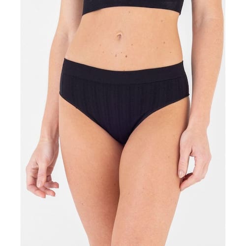 Cós em trama canelada: O cós em trama canelada oferece um melhor ajuste ao corpo, firmeza e controle na área da cintura, sem apertar ou deixar marcas.