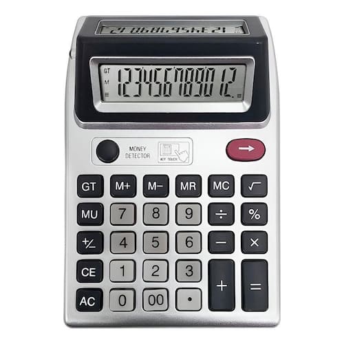 Funções: adição, subtração, multiplicação, divisão, potência, M+, M-, MR, MC e luz UV