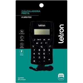 A Calculadora 8 Digitos Com Cordao Preto Letron possibilita somar alegrias e multiplicar a diversao. Ela e ideal para realizar calculos das quatro operacoes, porcentagem e raiz quadrada, tornando a matematica algo muito mais simples e descontraida. Para estimular ainda mais, seu design possui formato diferenciado, que faz com ela seja uma calculadora pratica para ser guardada no bolso e para estar sempre a mao. Destaque tambem para sua cor preta e o cordao na mesma cor que acompanha, propicio para carregar para todos os lugares com seguranca, alem de demonstrar grande estilo. Marca: Não Informado Ean: 7897256223337