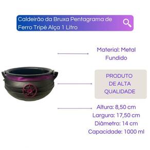 Caldeirão da Bruxa Pentagrama de Ferro Tripé Alça 1 Litro Caldeirão da Bruxa Pentagrama de Ferro Tripé Alça 1 Litro O CaldeiãoTripé em ferro fundido da Bialluz, ideal para seu altar ótima resistência e durabilidade. Peso: 1460 Kgr Diâmetro da boca: 14 cm Altura: 8,5 cm Capacidade: 1000 ml Observação: A limpeza de seu produto deve ser feita apenas com esponja, nunca utilizar lã de aço sem tampa. Acompanha Pentagrama. após ser lavado secar em fogo baixo. O caldeirão é um símbolo típico e poderoso em várias culturas principalmente na Wicca e umbanda. É um instrumento de força mística, magia e transformação. As bruxas têm muito usos práticos para caldeirões. Enviamos o seu pedido em até 24 horas após a confirmação de pagamento Caso tenha alguma dúvida nos mande mensagem que respondemos rapidinho para te ajudar da melhor forma possível Marca: Não Informado