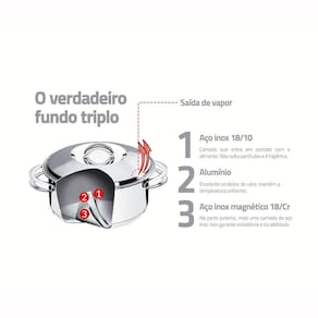 - Economiza tempo e energia: o segredo está no fundo triplo (aço inox + alumínio + aço inox), que distribui o calor uniformemente, proporcionando um cozimento mais rápido. Por isso, você pode manter o fogo baixo durante todo o preparo e, assim, poupar energia. Além disso, o caldeirão toda em aço inox pode ir ao forno para gratinar ou finalizar pratos, na temperatura máxima de 260C.