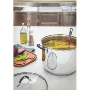 Economiza tempo e energia: o segredo está no fundo triplo aço inox + alumínio + aço inox , que distribui o calor uniformemente, proporcionando um cozimento mais rápido. Por isso, você pode manter o fogo baixo durante todo o preparo e, assim, poupar energia.