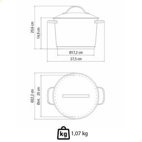 - Possui 20 cm de diâmetro e acompanha tampa com saída de vapor.