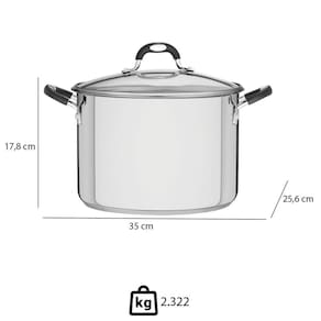 - Desenvolvida em aço inox, o utensílio conta com pegador e alças antitérmicas oferecendo mais no manuseio e ainda possui a tampa de vidro possibilitando, assim, visualizar o cozimento dos alimentos.