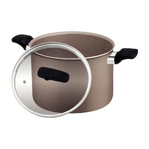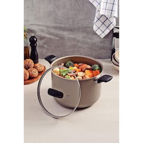 O caldeirão Tramontina Milazzo em alumínio com revestimento interno e externo em antiaderente Starflon Max amêndoa 26 centímetros de diâmetro 9,6 litros é ideal para grandes preparos. Produzido em alumínio com revestimento antiaderente Starflon Max, assegura um cozimento uniforme e fácil limpeza, evitando que os alimentos grudem. Suas alças de baquelite antitérmico com acabamento soft-touch garantem manuseio seguro e confortável. Inclui tampa de vidro temperado com saída de vapor e borda de aço inox, permitindo visualizar o preparo dos alimentos sem perder calor. Ele pode ser em fogões a gás, elétrico e vitrocerâmico, proporcionando grande versatilidade. Torne seus preparos mais eficientes e práticos com a qualidade e inovação da Tramontina!