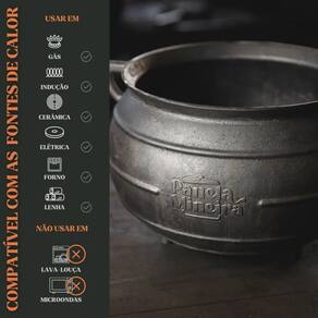 O Caldeirão Tripé Alça de Ferro da Panela Mineira é o tradicional caldeirão de ferro, em um estilo retrô que remonta o design de caçarolas e tachos antigas. Possui uma base e fundo arredondado, além de 03 pezinhos como apoio. Sua perfeita distribuição e retenção do calor promove uma cocção prolongada que enaltece o sabor e aroma dos alimentos. Pode ser utilizado para preparar diversas receitas, como caldos, tropeiros, carreteiros, carnes, copas, polentas, peixes, entre outros. Muito utilizada em eventos pela sua apresentação e por manter-se quente por muito mais tempo.