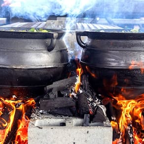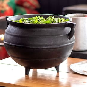 O Caldeirão Tripé Alça de Ferro da Panela Mineira é o tradicional caldeirão de ferro, em um estilo retrô que remonta o design de caçarolas e tachos antigas. Possui uma base e fundo arredondado, além de 03 pezinhos como apoio. Sua perfeita distribuição e retenção do calor promove uma cocção prolongada que enaltece o sabor e aroma dos alimentos. Pode ser utilizado para preparar diversas receitas, como caldos, tropeiros, carreteiros, carnes, copas, polentas, peixes, entre outros. Muito utilizada em eventos pela sua apresentação e por manter-se quente por muito mais tempo.