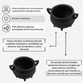 Caldeirão Tripé Miniatura Ferro Panela Mineira 6x5,5cm 100ml O Caldeirão Tripé Miniatura da Panela Mineira faz parte das réplicas que desenvolvemos de algumas panelas tradicionais da nossa marca. Com design tradicional e, ao mesmo tempo, autêntico, encanta qualquer apresentação, seja para servir porções individuais de acompanhamentos ou simplesmente decorar. Orientação de Uso e Conservação:Antes do primeiro uso: Lave com água e sabão, seque bem com um pano. Já vem pronta para uso, então não precisa ser curada. Após cada uso: Lave com água e sabão, usando uma esponja ou escova para remover todos os resíduos de alimentos. Se restarem resíduos, ferva água com um pouco de detergente para soltá-los. Pintura: Revestimento atóxico que garante durabilidade e proteção prolongada, sem causar nenhum dano à saúde. Características Técnicas e Medidas: Linha: Bares e Restaurantes.Material: Ferro Fundido.Modelo: Miniatura.Litragem: 100ml.Diâmetro: 6cm.Peso: 0,350Kg.Altura: 5,5cm. Itens Inclusos: 01 Caldeirão Tripé Miniatura Ferro Panela Mineira 6x5,5cm 100ml. Código: 1306PMProdutoLojaPlast.