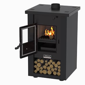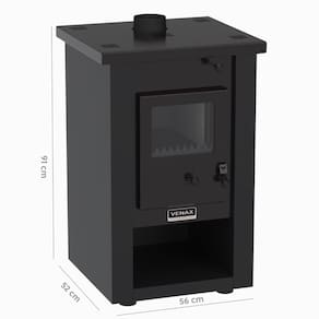Tipo: Calefator a lenha Marca: Venax Sistema de queima: Dupla combustão Sistema de controle de combustão: Sim Fornalha: Tijolos refratários pré-moldados Porta da fornalha: Vidro vitrocerâmico Tranca na porta da fornalha: Sim Gaveta de cinzas: Aço esmaltado Base para armazenamento de lenha: Sim Puxadores: Baquelite Guarnições das portas: Chapa de aço Pés: 4 pés reguláveis Revestimento corpo do fogão: Pintura eletrostática Saída da chaminé: Central na parte superior Medidas do produto: Altura 92,5cm - Largura 56cm - Profundidade 56cm
