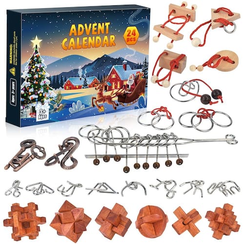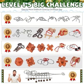 - Variedade de quebra-cabeças: feitos de metal e madeira duráveis, 8 quebra-cabeças de arame metálico, 6 quebra-cabeças de blocos 3D de madeira, 3 quebra-cabeças de metal e anel de cordas, 4 quebra-cabeças de madeira e cordas, 2 quebra-cabeças de fechadura, 1 quebra-cabeça de nove séries, 24 formas diferentes, 24 soluções diferentes, nossos quebra-cabeças garantem diversão duradoura enquanto você conta o Natal com este calendário de advento exclusivo