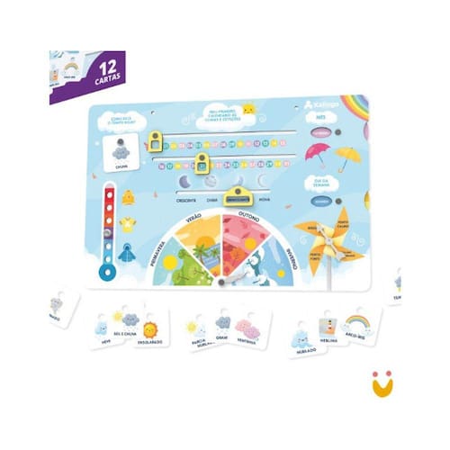 STEAM CALENDÁRIO DE CLIMAS E ESTAÇÕESO Steam Calendário de Climas e Estações, é composto por 12 cartas, que proporcionará às crianças o aprendizado dos diferentes climas, das estações do ano, as fases da lua, temperaturas, meses e dias da semana, possibilitando também a marcação da data atual no calendário! Além disso, oferece uma série de benefícios para o cotidiano e o desenvolvimento dos pequenos, de maneira lúdica e divertida. Indicado para crianças acima de 5 anos.Preço por unidade.Características:• Material: Plástico• Acompanha 1 cartela de adesivos• Possui 1 plataforma, 6 engrenagens e 6 cartões criativosMedidas:Dimensões do calendário: 26cm x 39cmDimensões da caixa: 40,5cm x 6cm x 30cmObservação:• Recomendado para crianças maiores de 5 anos• Possui certificação Inmetro: 007064/2020• Não recomendável para crianças menores de 5 anos por conter partes pequenas que podem ser engolidas ou aspiradas.