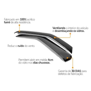 Com nossas calhas mesmo em dias chuvosos nos permitem de abrir as janelas de 4cm a 6cm dependendo do nível da chuva, e reduzindo os ruídos dos ventos quando a janela estiver aberta dando a possibilidade de ventilar o carro. MODELO: Calha de Chuva para Volkswagen Gol Quadrado 1987 a 1996 2 portas. Especificação Técnica: - 100% Acrílico - Modelo específico do veículo - Tamanho padrão de fábrica - Cor Fumê - Reduz ruídos do vento - Permite abrir em média 4cm do vidro em dias chuvosos - Possui sistema de fixação por fita 3M - Acompanha 1 Primer para limpeza ITENS INCLUSOS: - 1 Conjunto de Calha de Chuva. - 1 Primer para limpeza DIMENSÕES Tamanho padrão conforme as especificações da montadora. INSTALAÇÃO A instalação é feita de forma simples, podendo ser feita por você mesmo. de 30 dias para defeitos de fabricação. Marca: Não Informado
