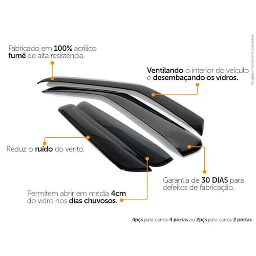 Especificação Técnica: - 100% Acrílico - Modelo específico do veículo - Tamanho padrão de fábrica - Cor Fumê - Reduz ruídos do vento - Permite abrir em média 4cm do vidro em dias chuvosos - Possui sistema de fixação por fita 3M - Acompanha 1 Primer para limpeza