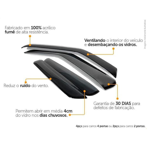 Especificação Técnica: - 100% Acrílico - Modelo específico do veículo - Tamanho padrão de fábrica - Cor Fumê - Reduz ruídos do vento - Permite abrir em média 4cm do vidro em dias chuvosos - Possui sistema de fixação por fita 3M - Acompanha 1 Primer para limpeza