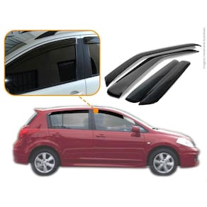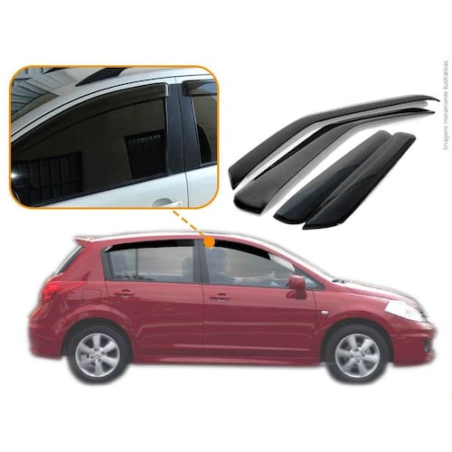 Calha de chuva nissan tiida hatch 2008 2009 2010 2011 2012 com nossas calhas mesmo em dias chuvosos nos permitem de abrir as janelas de 4cm a 6cm dependendo do nível da chuva, e reduzindo os ruídos dos ventos quando a janela estiver aberta dando a possibilidade de ventilar o carro. Modelo: calha de chuva para nissan tiida hatch 2008 a 2013 4 portas. Especificação técnica: - 100% acrílico - modelo específico do veículo - tamanho padrão de fábrica - cor fumê - reduz ruídos do vento - permite abrir em média 4cm do vidro em dias chuvosos - possui sistema de fixação por fita 3m - acompanha 1 primer para limpeza