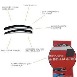 Com design flat e sistema de fixação que não agride a pintura do carro, as calhas Marçon foram projetadas para proporcionar um design inovador ao seu veículo. Em dias de chuva, permitem que o motorista e passageiros mantenham a janela com determinado espaço aberto sem infiltração de água, o que ajuda a não embaçar os vidros e mantem a circulação de ar dentro do veículo, garantindo conforto. São uma ótima opção para os veículos que não possuem ar-condicionado. Fabricada em acrílico de alta qualidade e durabilidade, as calhas possuem proteção contra raios UV e diversas condições climáticas. Além disso, a instalação é simples e rápida pois é feita através de fitas dupla face que acompanham o produto.