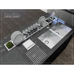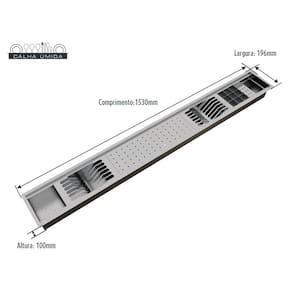 O modelo Kitchen 6 módulos com porta horta contém: 02 módulos para pratos (total para 12 pratos), 01 módulo para copos, 01 módulo com 09 recipientes para talheres e utensílios, 01 módulo porta esponja com detergente e 01 módulo porta horta ou gelo. Tradicionalmente conhecido como escorredor de louças, a calha úmida vai completar sua cozinha e espaço gourmet. A linha Kitchen 6 módulos traz praticidade e sofisticação para seu projeto, podendo ser instalada no granito, corian, madeira entre outros materiais. Instalação sobreposta ou embutida sob o tampo. A calha irá coletar toda água dos escorredores e escoará diretamente pelo esgoto através de um dreno (acompanha o produto) no centro da peça o qual poderá ser ligado no sifão da cuba ou em um ponto exclusivo de esgoto para calha.