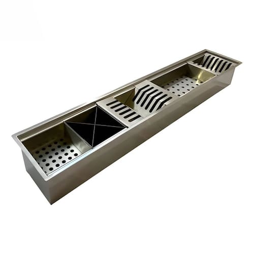 Informações Complementares: calha úmida gourmet, calha domum, calha inox, calha cinza, calha gourmet 90cm, organizador de pia, calha para cuba, calha modular, calha para pratos, calha para talheres, calha para copos, calha embutida, calha sobreposta, calha cozinha moderna, calha ban