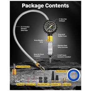 Esta ferramenta essencial de carro portátil 3 em 1 oferece um calibrador de pressão de pneus com inflador, permitindo a desinflação, inflação e verificação da pressão dos pneus. Compatível com todas as saídas de compressores de ar NPT, incluindo Conexão Rápida NPT, sendo um ótimo presente para homens. O calibrador de pressão de pneus com inflador mede com precisão de 0100 PSI, atendendo aos padrões ANSI B40.1. Possui mangueira trançada resistente a vazamentos e um conector giratório de latão sólido. Seu mostrador luminoso facilita a leitura mesmo no escuro. Pode ser utilizado em diversos veículos, como caminhões, SUVs, carros e motocicletas, aumentando a segurança na condução. A calibragem adequada dos pneus reduz o risco de falhas causadas por pressão incorreta, além de diminuir o consumo de combustível, custos de manutenção e despesas com reparos, aumentando a vida útil dos pneus. Acompanha diversos acessórios, como bico de ar, adaptador de válvula Presta e manual de instruções.