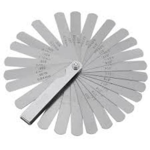 Calibre de folga 23 laminas, para comprovar e ajustar o espaço entre duas peças, como tolerância de válvulas, folga nas velas de ignição e contatos do distribuidor, lâminas de aço endurecido e temperado, gravadas com medidas em polegadas e milímetro.