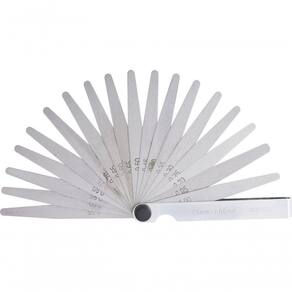 - 1 Calibre de folga com 20 lâminas: 0,05 mm, 0,10 mm, 0,15 mm, 0,20 mm, 0,25 mm, 0,30 mm, 0,35 mm, 0,40 mm, 0,45 mm, 0,50 mm, 0,55 mm, 0,60 mm, 0,65 mm, 0,70 mm, 0,75 mm, 0,80 mm, 0,85 mm, 0,90 mm, 0,95 mm e 1,00 mm